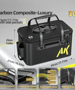 Sa grande capacité permet de stocker des poissons vivants, des appâts ou de l’eau pour le nettoyage du matériel. Grâce à sa poignée solide et sa bandoulière réglable, il est parfait pour toutes vos sorties de pêche en mer, rivière ou lac.